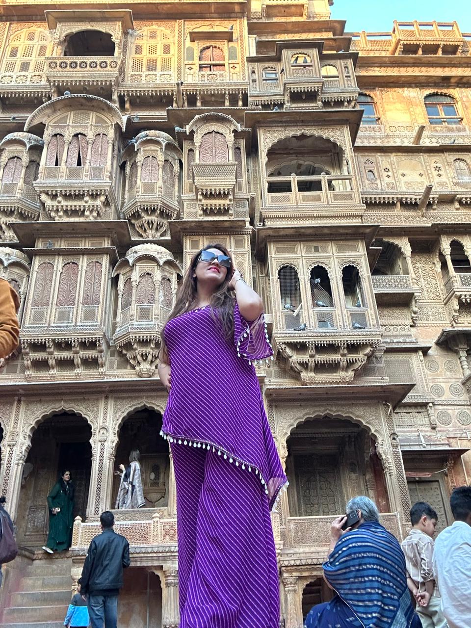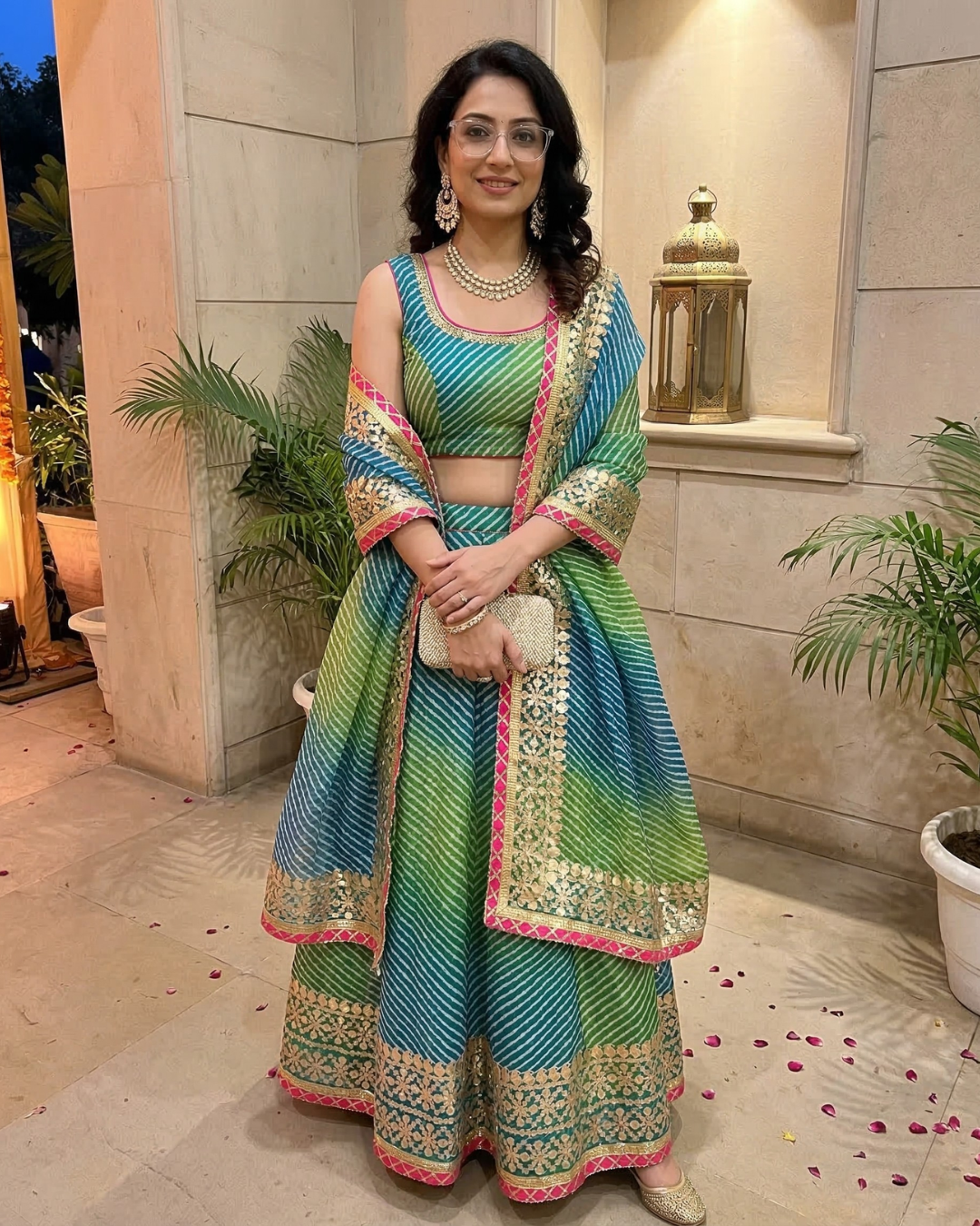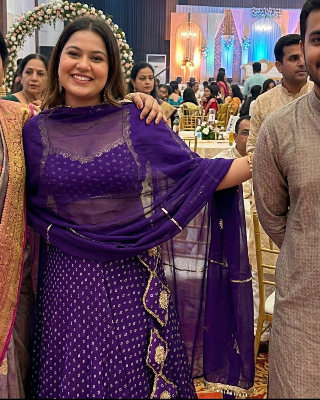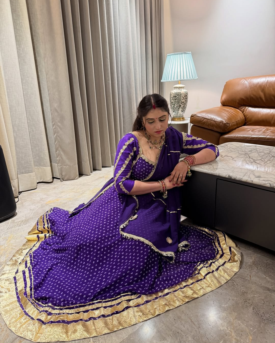 Absolutely in love with this violet Bandhej lehenga! The fabric feels luxurious and the gota work is so elegant.