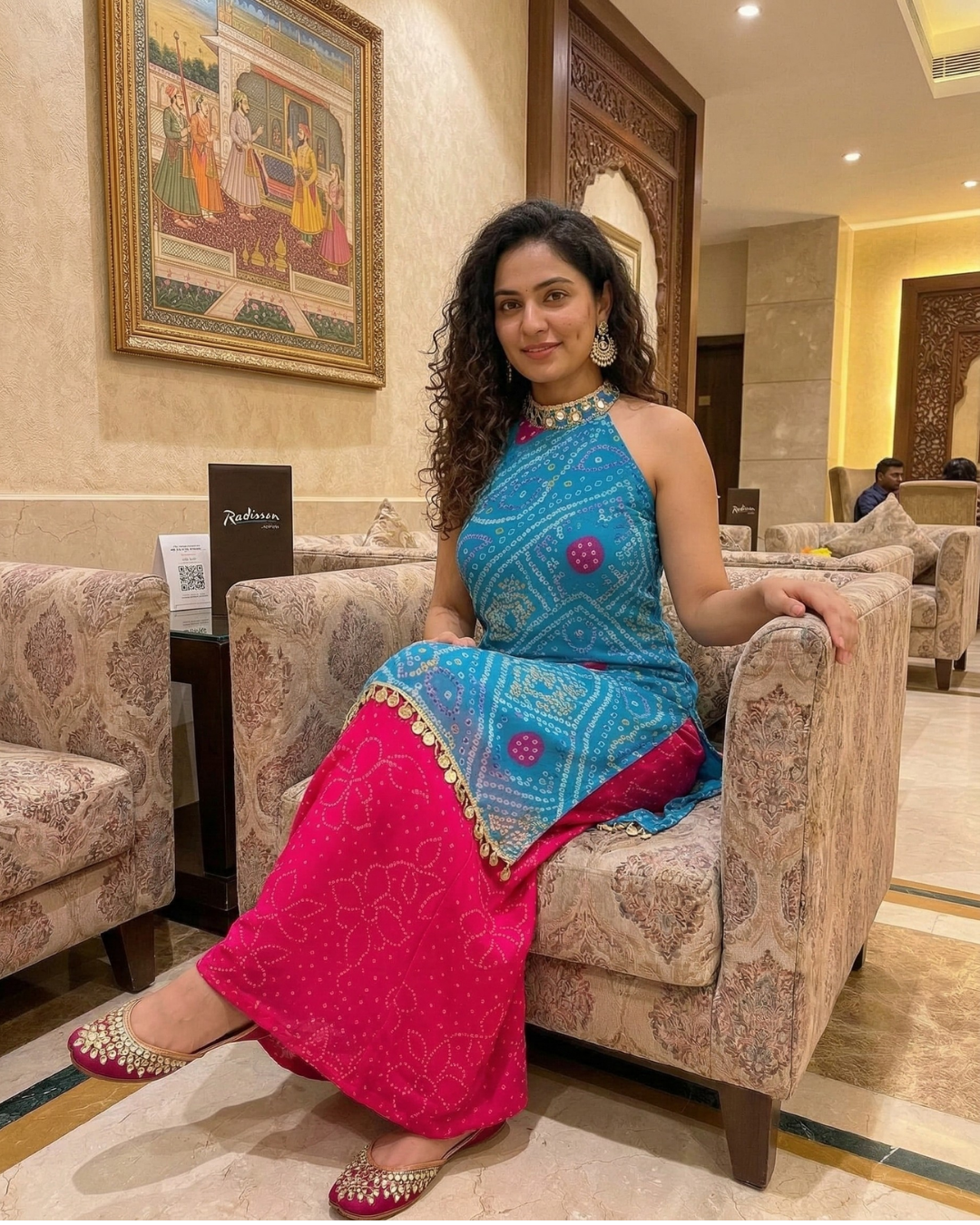 Such a refreshing color! The Bandhani print and mirror detailing make it festive yet super comfortable for long events.